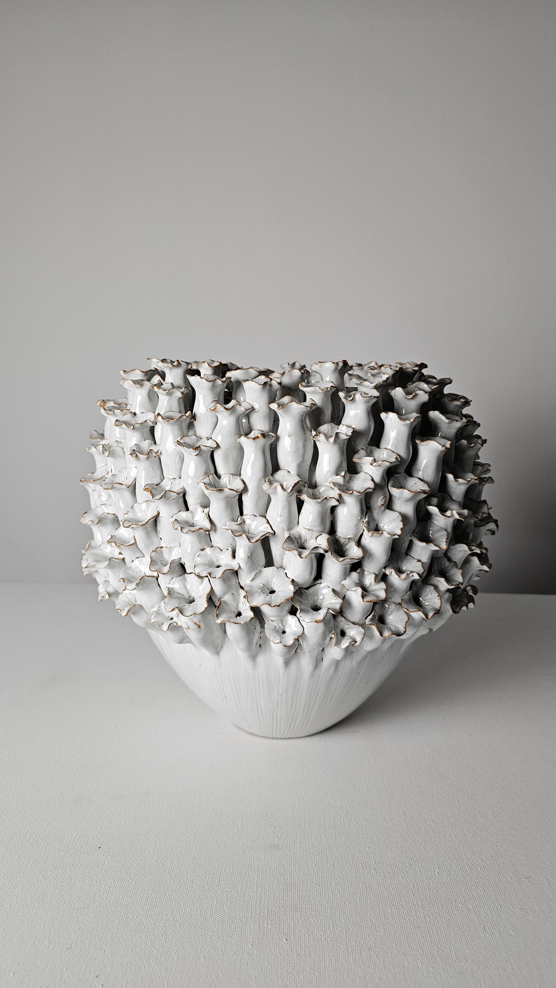 Inspired by trumpet flowers and sea polyps, the Atlantis Angel Trumpet Bloom Vase is a tactile, sculptural celebration of organic form. Each trumpet-shaped bloom is individually hand-sculpted and glazed, creating a richly layered texture reminiscent of coral gardens and underwater blossoms.