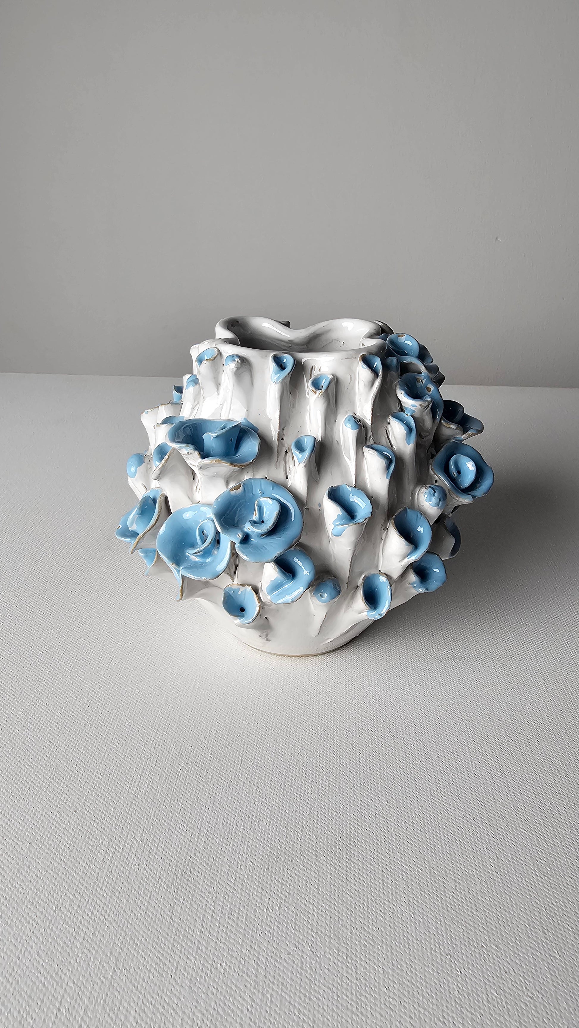 Soft, sculptural, and evocative, the Atlantis Bluebell Vase is adorned with delicate trumpet-shaped blooms in a serene ocean blue. Each bloom is individually hand-shaped and glazed, creating a tactile, layered surface reminiscent of underwater flora and wild bluebell fields.