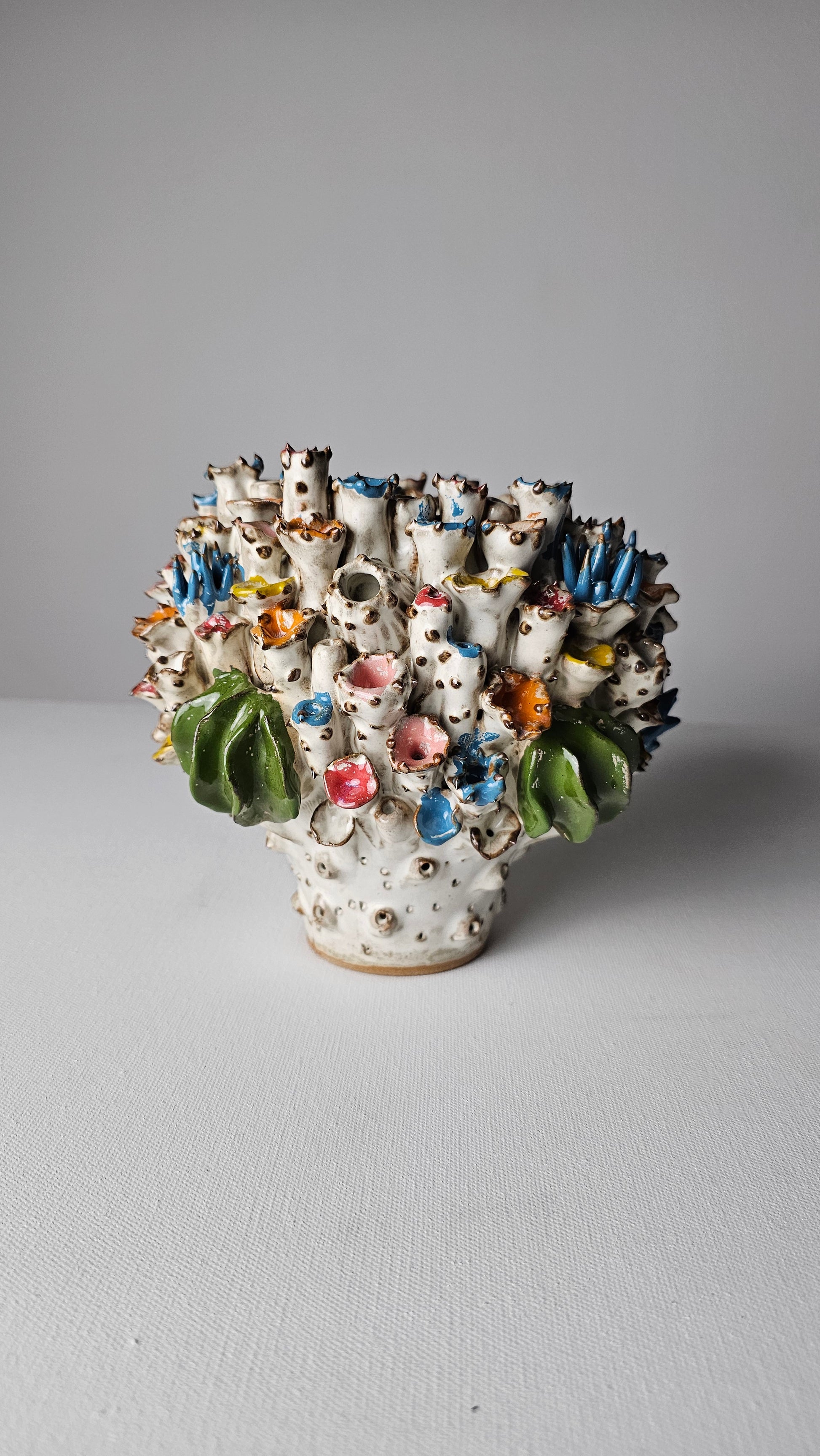 A playful celebration of color and form, the Atlantis Fantasy Vase is adorned with whimsical, hand-sculpted blooms in joyful hues of blue, red, yellow, and green. Each organic trumpet-like bloom is individually glazed, creating a textured, lively surface that evokes fantastical coral gardens and underwater worlds.