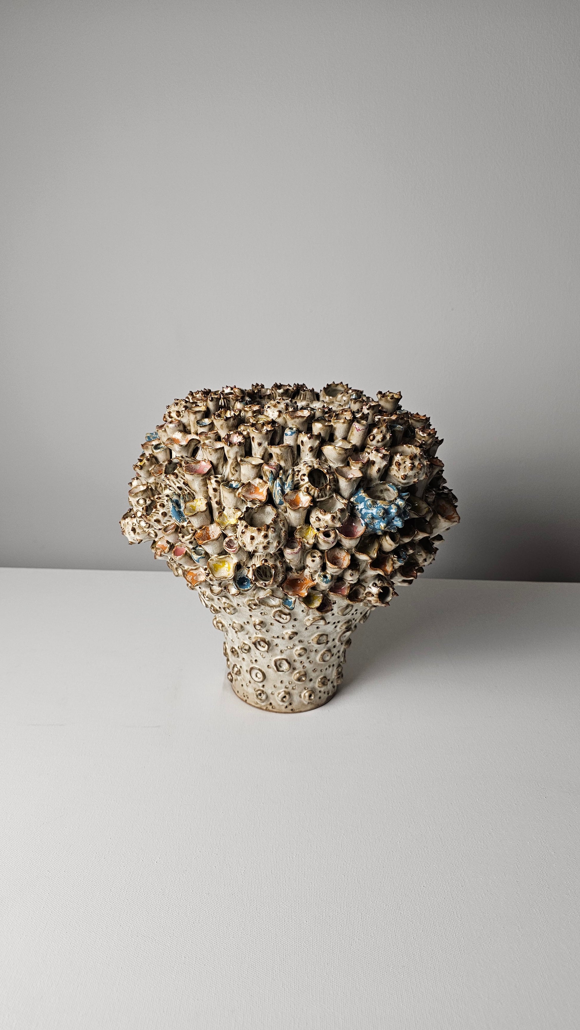 Bursting with sculptural charm, the Atlantis Wildflower Vase is adorned with colorful, trumpet-shaped blooms that dance across its organic form. Each bloom is individually hand-shaped and glazed in joyful hues, evoking the carefree spirit of a wildflower meadow and the textures of a coral garden.
