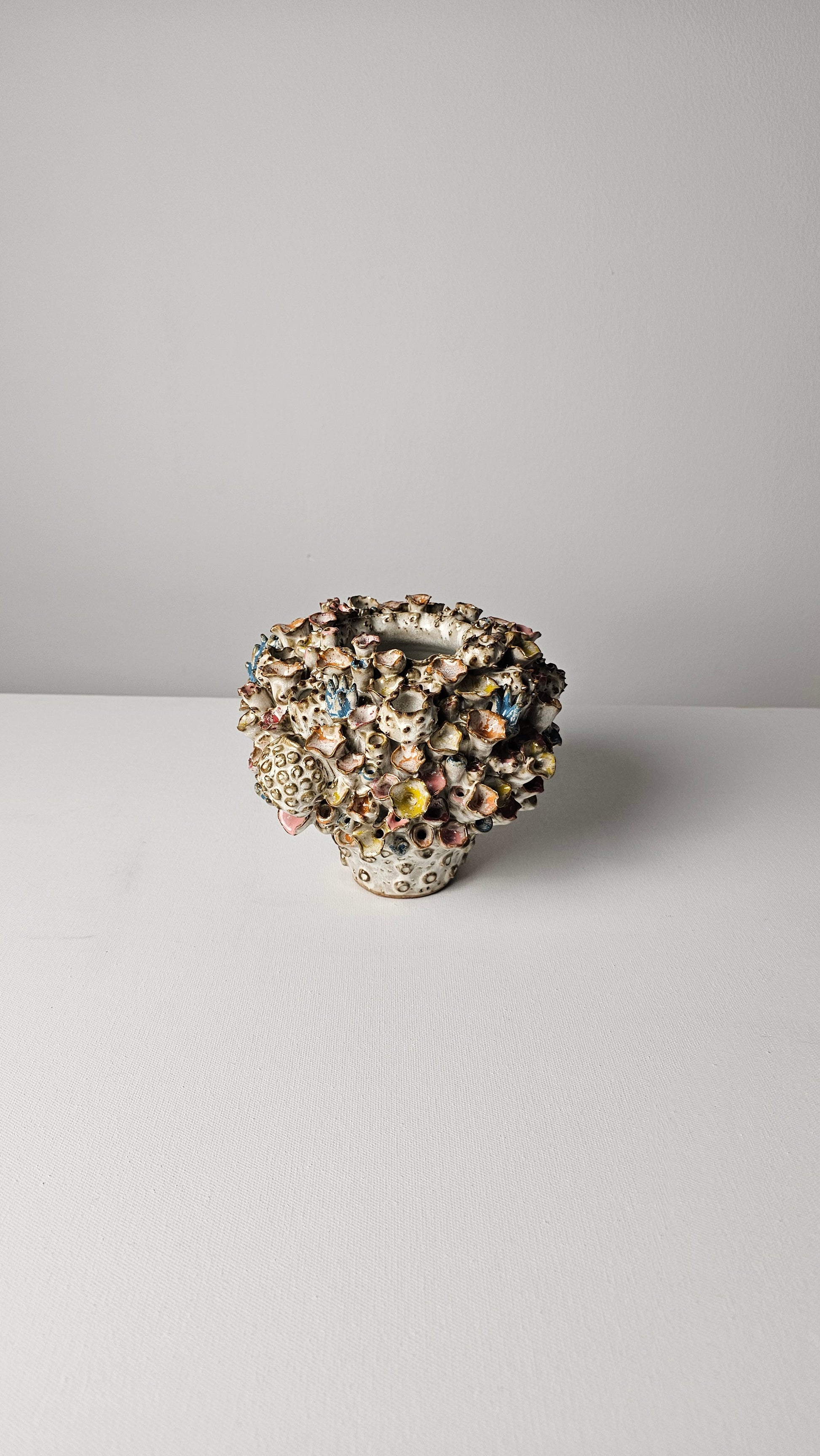 Bursting with sculptural charm, the Atlantis Wildflower Vase is adorned with colorful, trumpet-shaped blooms that dance across its organic form. Each bloom is individually hand-shaped and glazed in joyful hues, evoking the carefree spirit of a wildflower meadow and the textures of a coral garden.