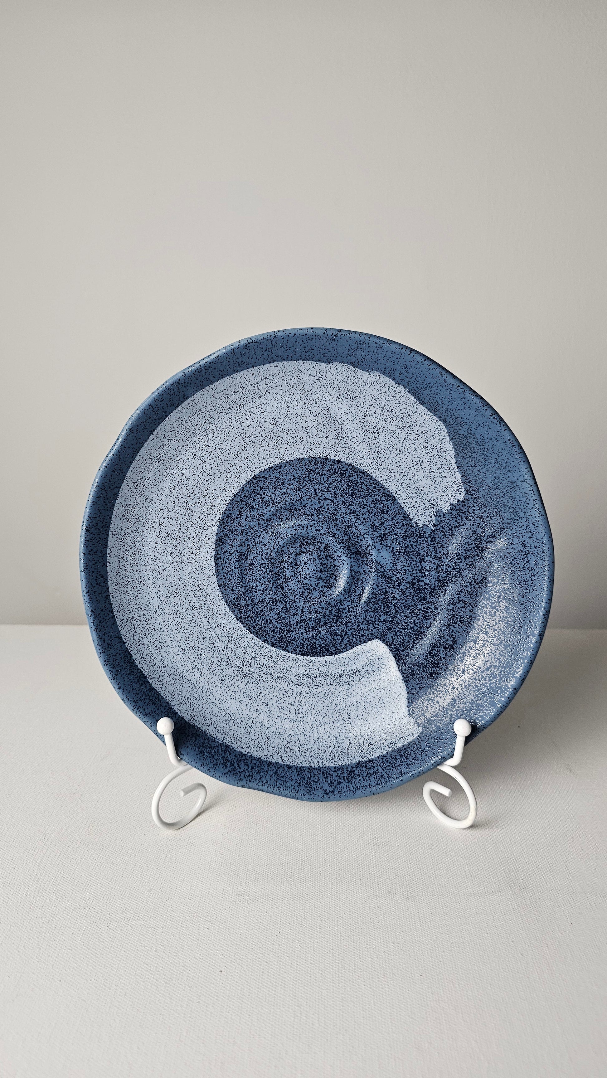 These plates feature distinct, expressive circular and spiral patterns created by the interplay of different glazes and hand-painted designs. The collection showcases a variety of shapes (round and square) and earthy color palettes, including whites, browns, blues, and dark, volcanic-like textures. The overall aesthetic is one of rustic, organic beauty combined with minimalist, artistic depth.