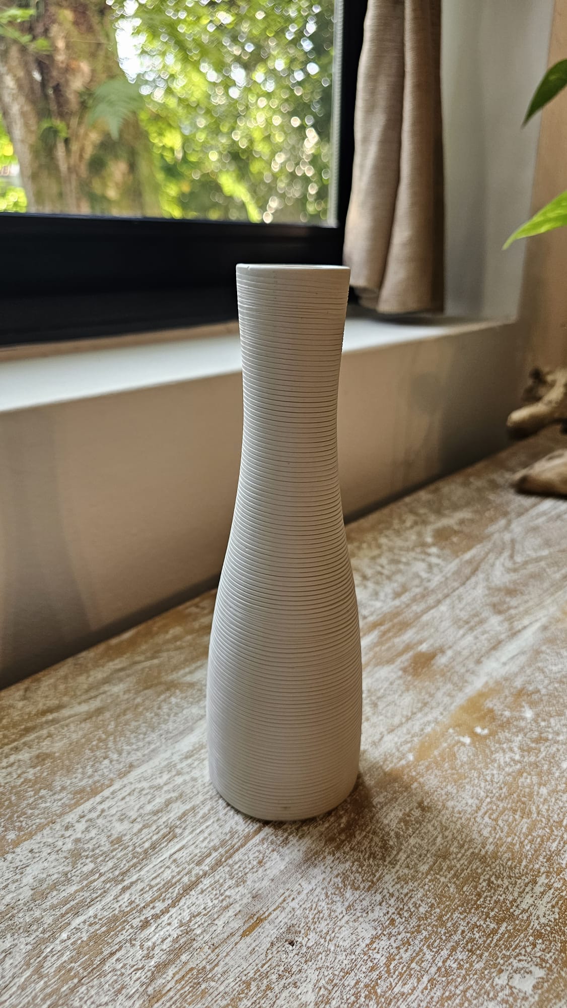 Introducing a slender vase, a sleek and contemporary addition to your home decor. This elegant vase boasts a slender silhouette with a gradual narrowing towards the top, creating a graceful neck that enhances the visual appeal. It's minimalistic design and clean lines make it a versatile choice for showcasing both fresh flowers and artificial arrangements.