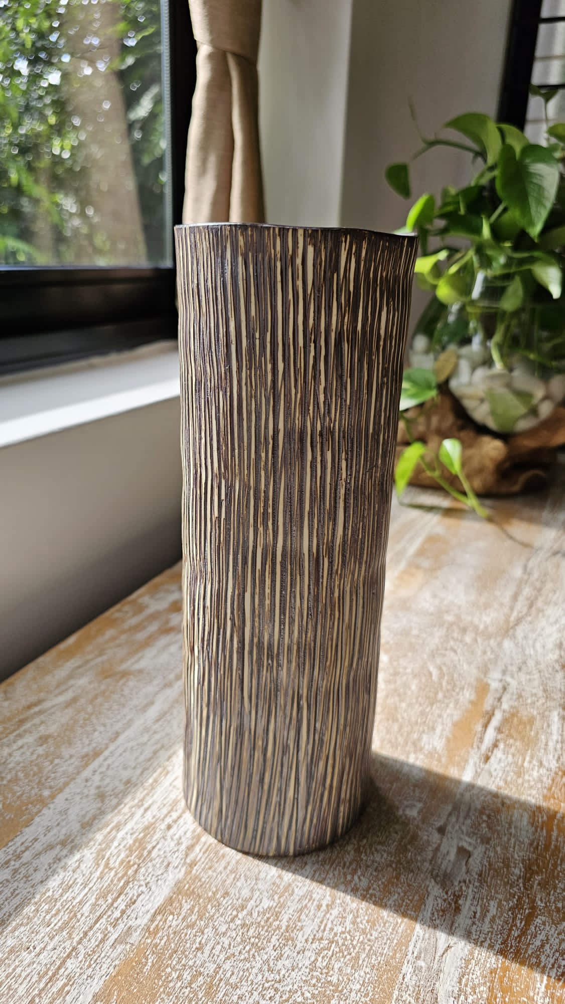 Introducing "I'm a Tumbler" Cylinder Vase, a sleek and versatile piece that effortlessly combines form and function. This cylindrical ceramic vase is designed to bring modern elegance to any setting, showcasing clean lines and a minimalist aesthetic.