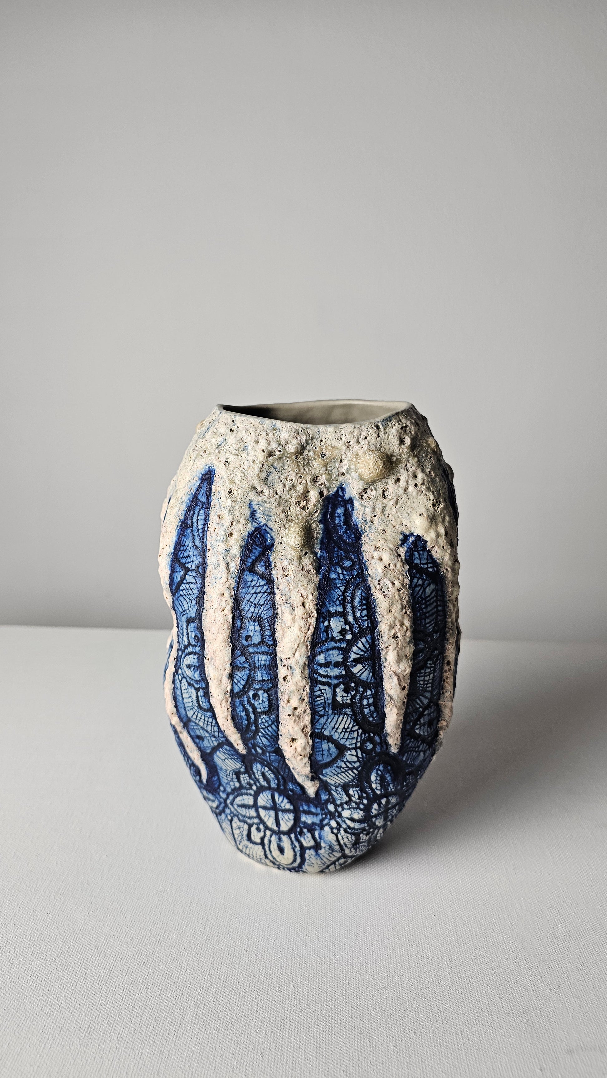 Inspired by the textures of coastal cliffs and the intricate beauty of Mediterranean artistry, Lace of the Sea weaves together raw stone-like textures and deep indigo patterns. Its organic form captures the timeless elegance of the Aegean — where nature and craft meet in perfect harmony.