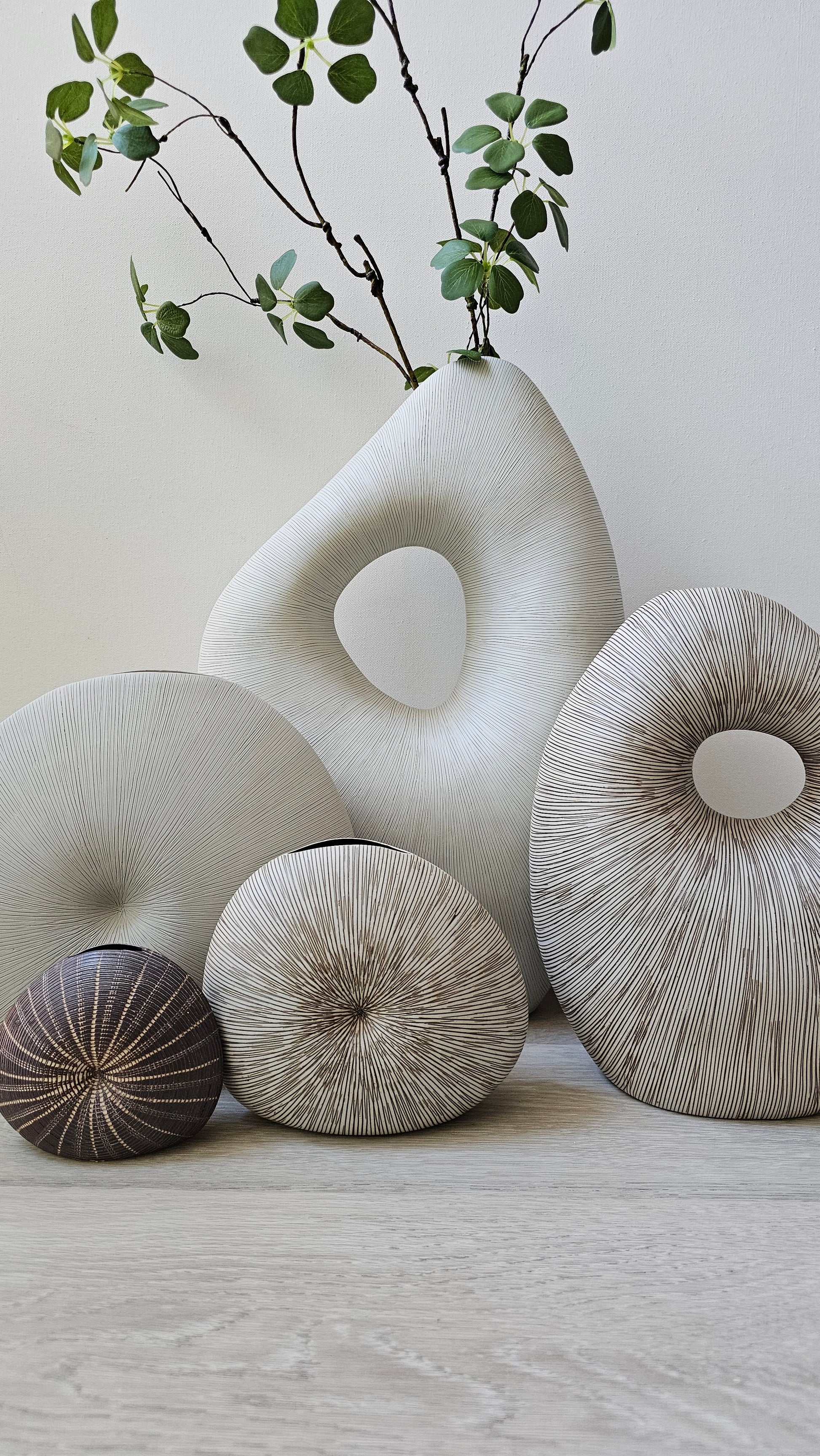 Introducing The Signature Vase, a masterpiece of natural beauty and exquisite craftsmanship. This stunning vase features a unique and natural shape with a captivating hole in the middle, adding an intriguing element to any space. Each piece is meticulously handcrafted with utmost care and attention to detail, showcasing the artisan's skill and dedication.