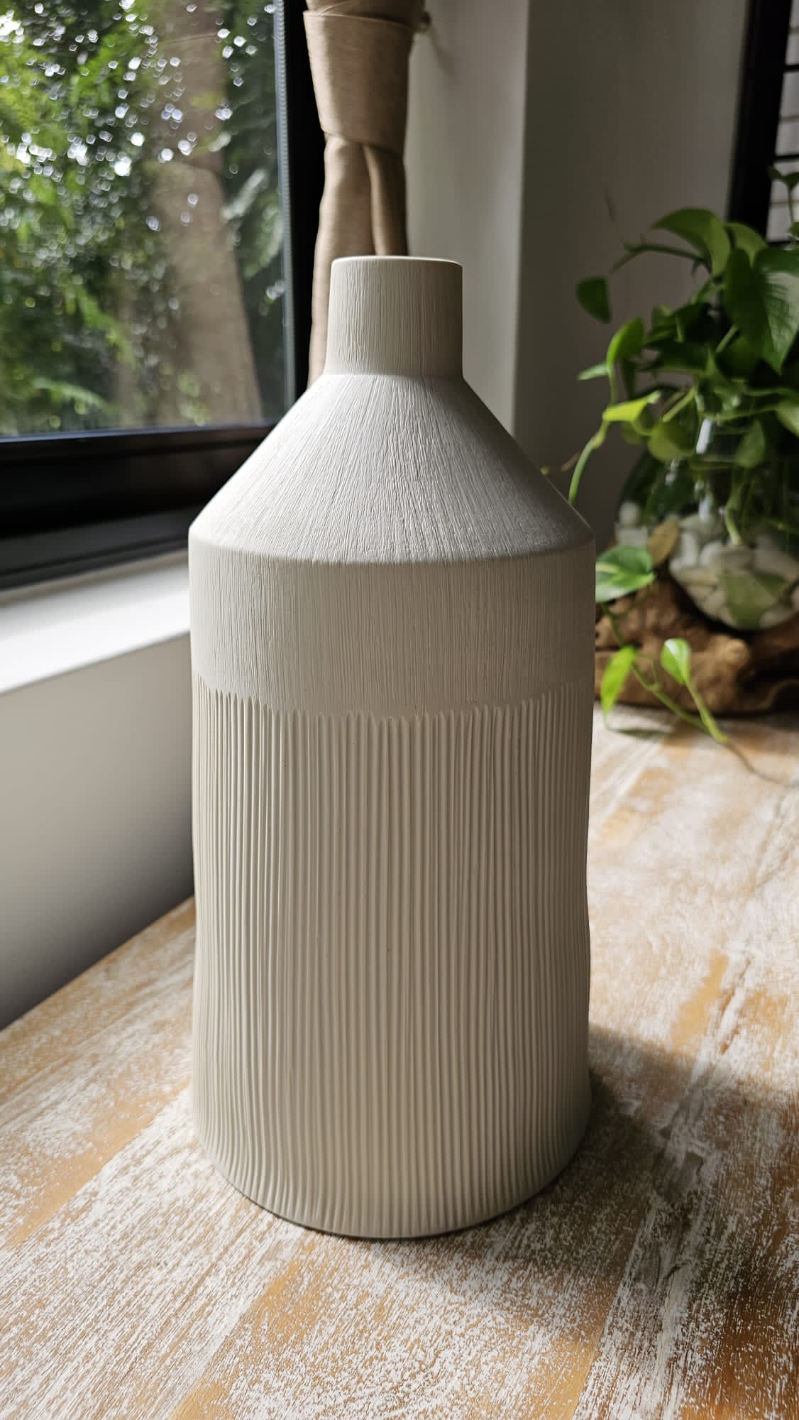 A distinctive ceramic piece that makes a bold statement in your living space. The unique combination of the "light house" shape and flat bottom adds visual interest and stability to the vase, it's generous neck allowing you to showcase your favorite floral arrangements with confidence and style.