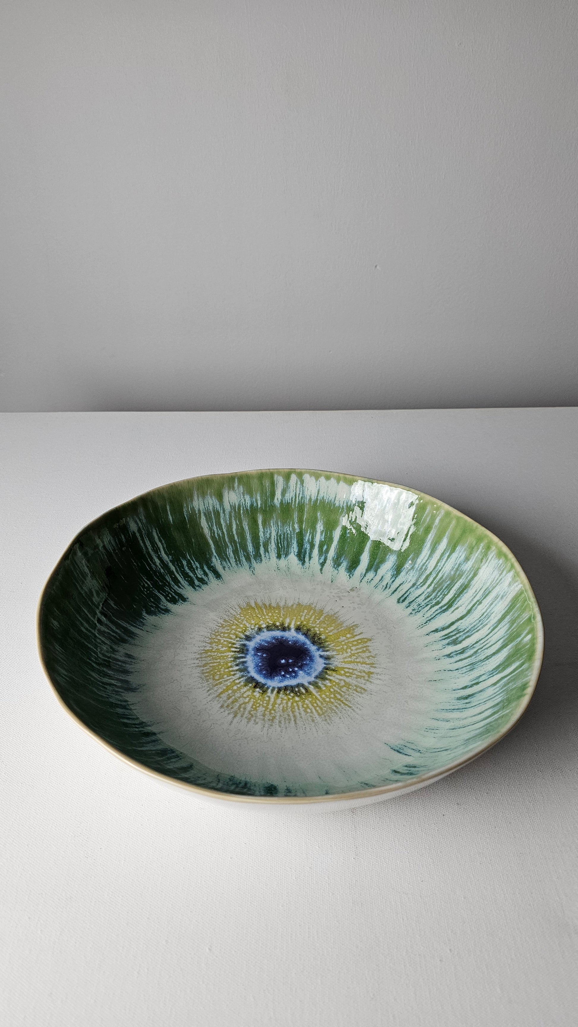 A tribute to Santorini’s golden light and olive-dotted hills, Sunlit Olive radiates warmth and harmony. Hand-painted in soft greens and sun-kissed tones with a deep blue heart at its center, it reflects the meeting of land, sea, and sunlight in perfect Mediterranean balance.