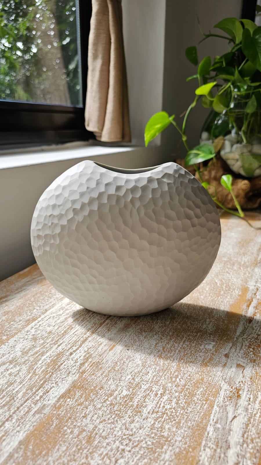 A modern and artistic piece that brings a touch of playfulness to your home decor. Inspired by the iconic shape of a disk with a bite taken out, this ceramic vase is a delightful blend of contemporary design and whimsical charm.