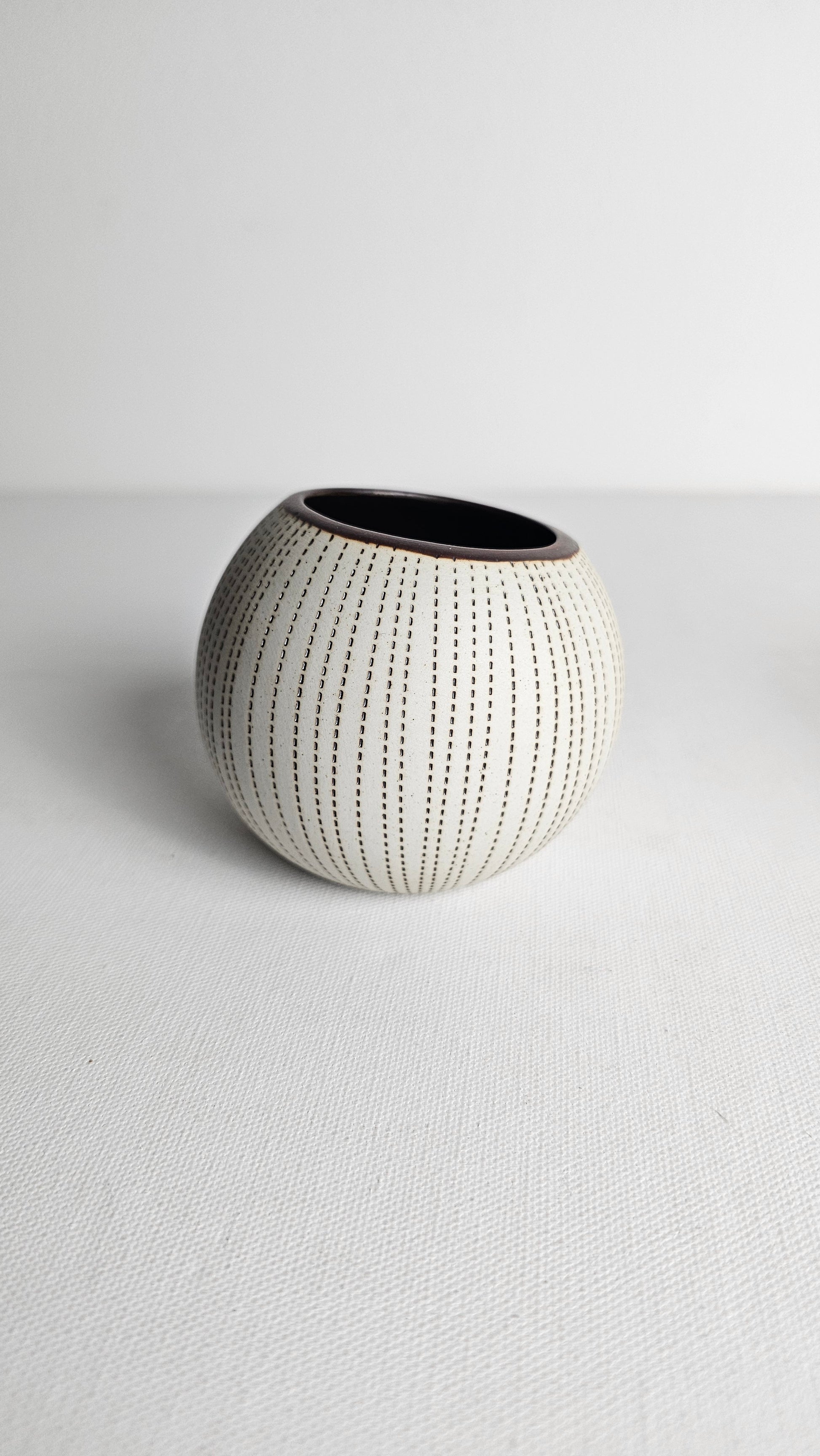 A small ceramic masterpiece that combines elegance with a playful touch. Shaped like a spherical cup, this vase exudes a unique and adorable appeal.