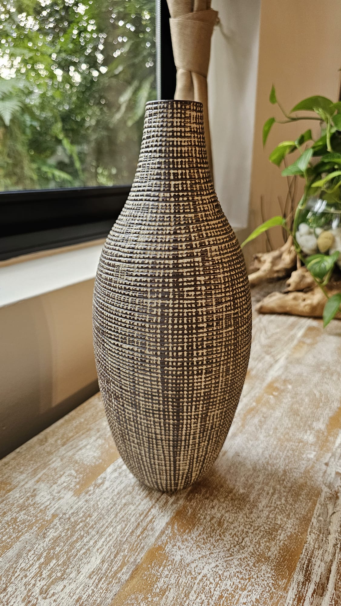 A remarkable tall vase that embodies the perfect harmony of style and versatility. Inspired by the allure of an elongated bottle, this stunning piece is thoughtfully designed to complement your living space with its captivating presence.